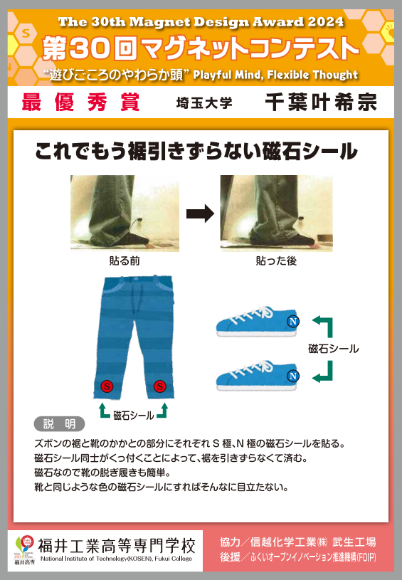 | 最優秀賞 | これでもう裾引きずらない磁石シール | 埼玉大学 |