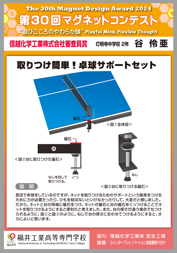 | 信越化学工業株式会社審査員賞 | 取りつけ簡単!卓球サポートセット | 灯明寺中学校 2年 |