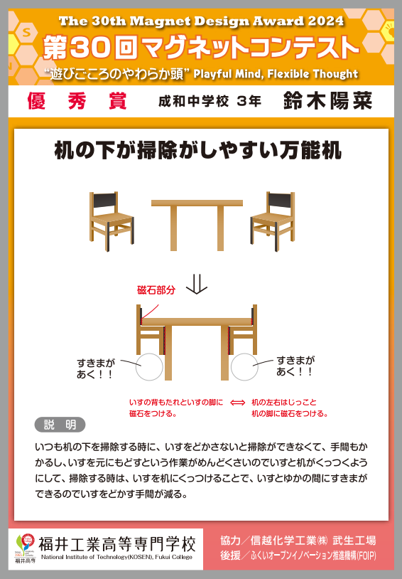 | 優秀賞 | 机の下が掃除しやすい万能机 | 成和中学校 3年 |