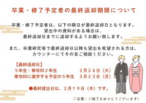 卒業・修了予定の方の最終貸出日と最終返却日は以下の通りです。 期限内の返却を厳守してください。