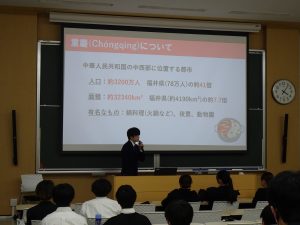 始めに、中国の大学との学術交流に参加した学生は、日本と中国との違いを中心に説明し、自分の研究内容を発表したことを話していました。