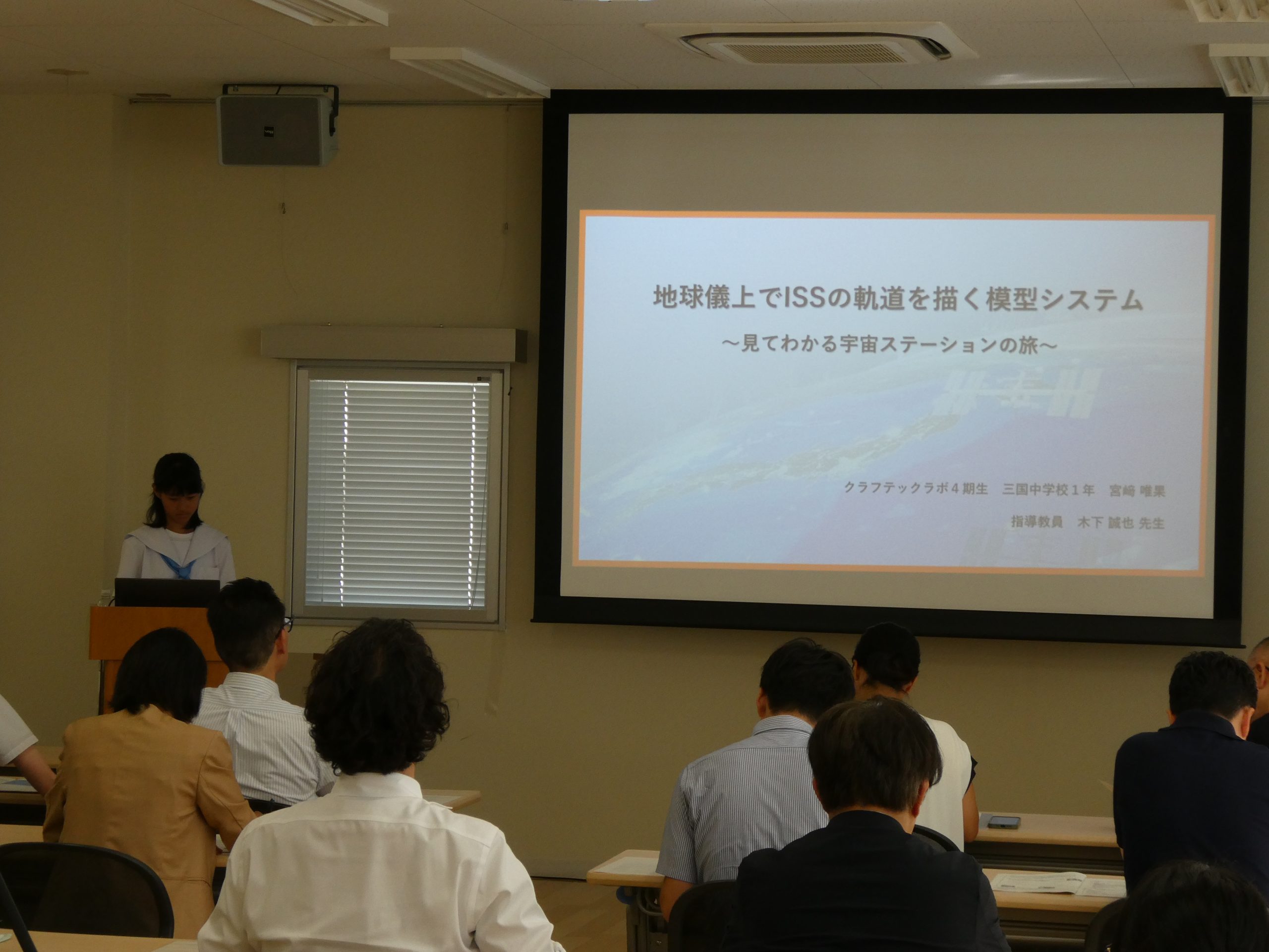 最優秀賞には、中学1年生の宮﨑唯果さんによる「地球儀上でISSの軌道を描く模型システム-見てわかる宇宙ステーションの旅-」