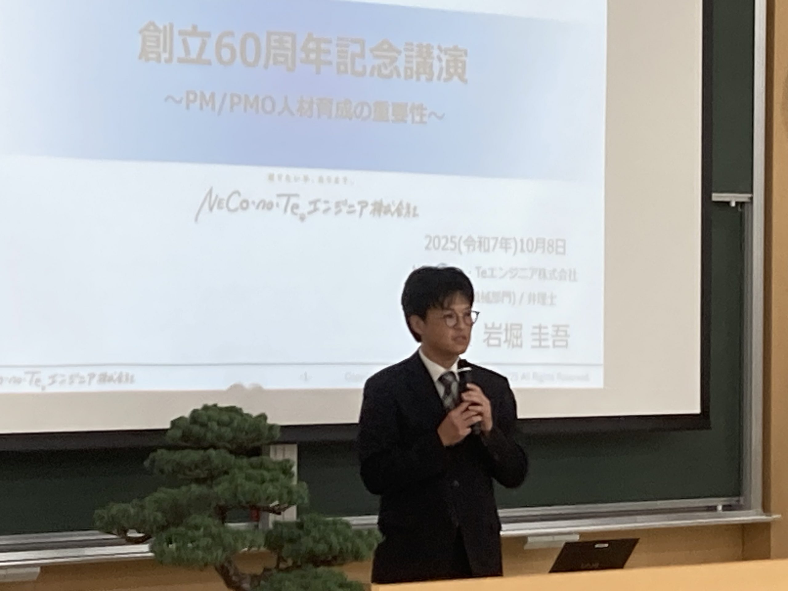 記念式典の後は同会場で、本校の卒業生でもあり、NECO・no・Teエンジニア株式会社代表取締役の岩堀圭吾様をお招きし、記念講演を実施しました。