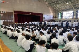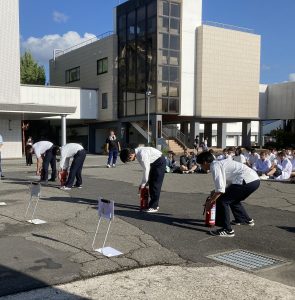 安全を確保する「シェイクアウト訓練」を行いました。その後、「地震」による火災が発生したことを知らせる校内の放送に