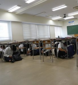 まず、「訓練」の緊急地震速報により、揺れがおさまるまで、机の下にもぐり、まず低く、頭を守り、動かないよう身の