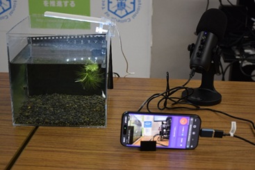 会見会場では、支援機器の一つとして、スマートフォン上で水槽を泳ぐメダカに向けて話しかけると、人工知能(AI)を活用して会話の疑似体験ができるシステムの実演がされました。このシステムにより自分のことを表現することが苦手な子供が自分の感情を言葉にしたり、他者への理解を深めることができるとのことで、児童がメダカと話した記録を保護者や学校、放課後デイサービス等で共有することにより、連携しての支援につながるとの説明がされました。