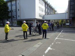 4/9(木)に鯖江警察署およびスクールサポーターが、自転車で登校する学生を対象に