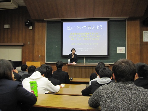 12月8日(木)14時40分から大講義室に於いて、1年生を対象に「性について考えよう」~人生設計のひとつとして向き合ってみよう~と題した講演会を、鈴木クリニック 副院長 鈴木 綾子先生を講師に迎え開催しました。無防備な性行為がもたらすリスク(性感染症、望まない妊娠)他、LGBT,性暴力についてと幅広い観点から話を聞き、10代の性に対する正しい知識を習得することで、性に対して正しく向き合える大変有意義な講演会となりました。
