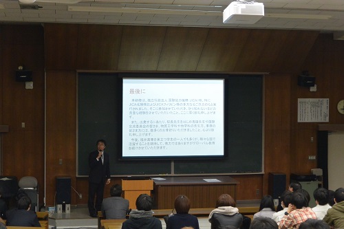 教員の報告では、物質工学科の佐々准教授が、フィリピンのストリートチルドレンの問題や教育現場で見えてきた問題について詳細な説明があり、今回の貴重な経験を今後も継続して学生へ還元していきたいと決意が延べられました。