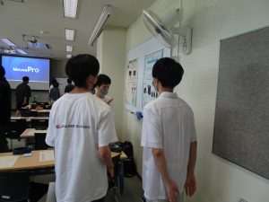 7月20日(水)には、最終発表を行いました。最終発表では、発表5分、質疑応答4分の限られた時間の中で、各チームが3Dプリンタを用いて製作した小型の製品を提示しながら、デザイン案、中間発表からの改善案などを発表しました。休憩時間にも、各チームが作成したポスターの前で活発な意見交換が行われました。