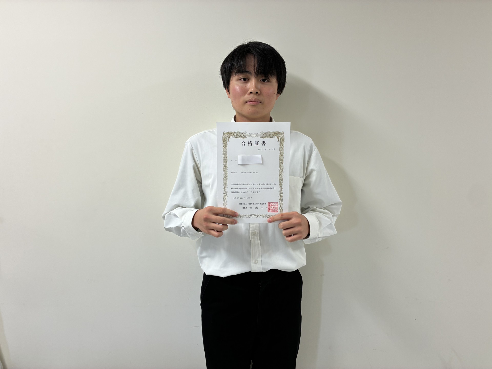 もう一人の合格者となった埜村駿君は本校卒業から2年目(社会人2年目,大学4年生に相当)となります.現在,埜村君はきんでん株式会社の建築部門に勤務しています.