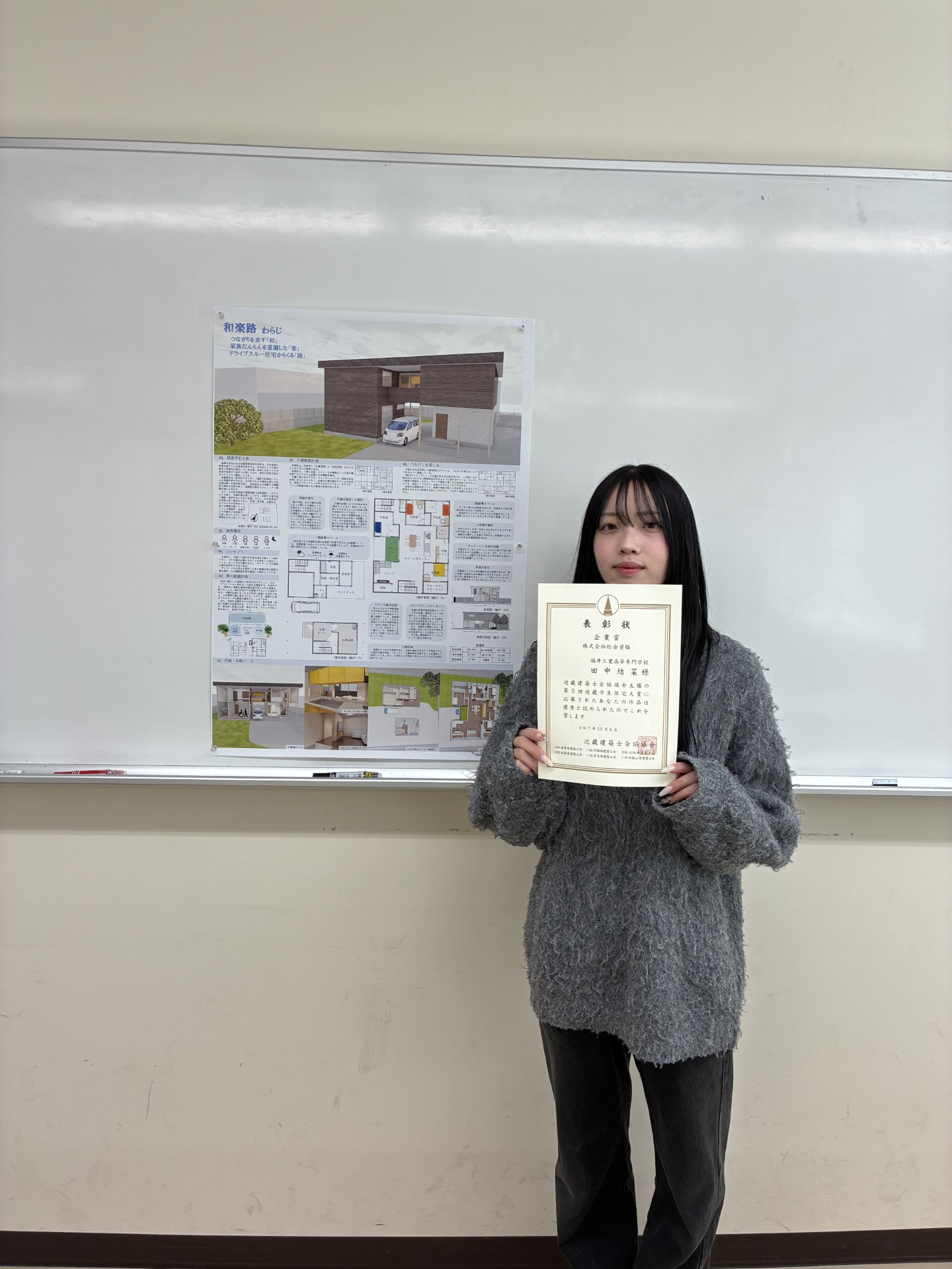 2025年12月6日に第5回近畿学生住宅大賞の表彰式が大阪建築健保会館で開催されました。環境都市工学科5年生の田中結菜さんが応募した「和楽路 わらじ」が応募者63件の中から企業賞(総合資格)を受賞しました。日々の努力が実を結び、歴史あるコンペにて企業賞を受賞することができました。